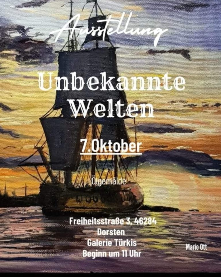 Die Galerie Türkis freut sich in den Monaten Oktober und Dezember die künstlerischen Arbeiten von Mario Ott ausstellen zu dürfen. Der in Dorsten lebende Künstler wird die vorhandene Vielfalt kurzzeitig um z.B. phantasievolle Landschaften, gemalt mit Ölfarben, bereichern.