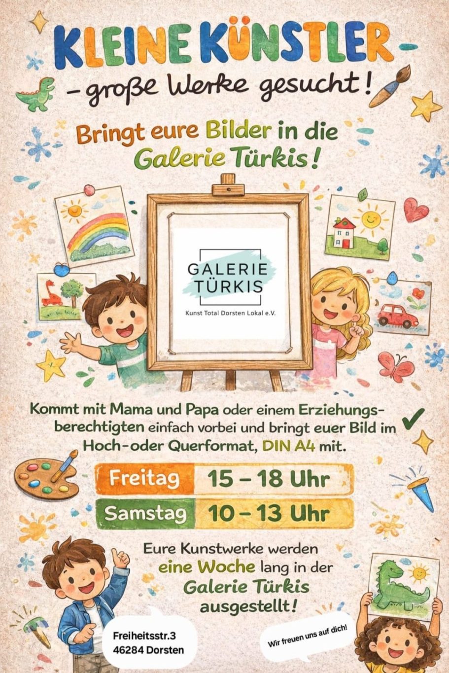 In den Monaten Juli und August 2025 bieten wir Künstler*innen aus der Umgebung die Möglichkeit an, bis zu 3 Kunstwerke in der Galerie Türkis zu präsentieren.